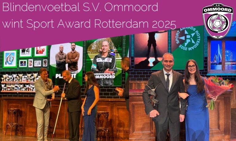 Op vrijdagavond 23 januari jl. werden in theater Zuidplein de Sport Awards Rotterdam 2025 uitgereikt. Deze avond werd gepresenteerd door Gert van ’t Hof (bekend van TV Rijnmond en Studio Sport). Het blindenvoetbalteam van S.V. Ommoord was genomineerd in de categorie ‘meer dan sport’. Initiatiefnemer Gashi mocht, samen met zijn dochter Sarina, de gewonnen prijs in ontvangst nemen uit handen van een van onze Rotterdamse uithangborden Sander de Kramer. De geweldige prestatie om binnen een jaar tot het grootste blindenvoetbalteam van Nederland uit te groeien werd hiermee meer dan beloond.