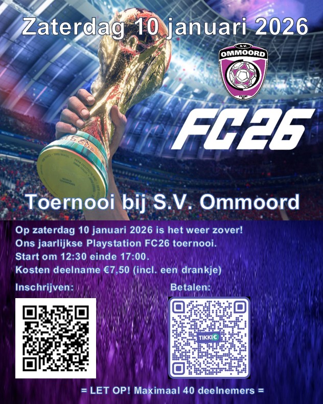 Op zaterdag 10 januari 2026 organiseert S.V. Ommoord samen met MarsEvents voor de 9e keer een Playstation toernooi. Dit jaar met FC26 van EA Sports. Het toernooi zal plaatsvinden in de kantine, start om 12:30 en duurt tot ongeveer 17:00.